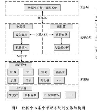 本係統主(zhǔ)要分三個層,采集層、雲平(píng)台層、業務層(céng)。其中采集層主要是由UPS、PDU、電表、溫濕度等動(dòng)環設備與(yǔ)IT資產采集設備組成;雲平台層主要是存儲設備數據以(yǐ)及(jí)進行(háng)大數據分析;業務層則是展示給用戶的數據中心集中管理係統。整體架構如(rú)圖1所示(shì)。