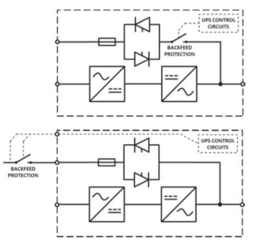 重要(yào)的是要理解,包括(kuò)半導體(tǐ)和(hé)晶閘管(guǎn)的靜態(tài)開關以及相關聯的控製和緩衝電路(lù)可能不能為(wéi)上遊電氣網(wǎng)絡的安全維護提供足夠的隔離,即(jí)使其正如企(qǐ)業所預期的那樣工作。當靜態(tài)開關晶閘管的門極信號(gate signal)關閉(bì)並且不通過電源時(shí),電路可能會(huì)在上遊泄漏一些(xiē)電壓和電流,其足以對人員造(zào)成(chéng)危害。因此,反向饋電保(bǎo)護主要是在正常(cháng)運行條件下用於UPS係統(tǒng),而不僅僅是(shì)經(jīng)常被認為的故障情況。