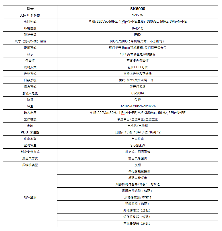 采用SK係列19英寸(cùn)標準機櫃,櫃體前門為單開密閉玻璃門,後門為單開(kāi)密封鈑金門;配置應急通風係(xì)統,具有排風功能。櫃(guì)體尺寸為600*1200*2000mm(寬*深*高);提供3kVAUPS不間斷電源和3.5KW製冷量,係統具備10英寸觸摸屏監控係統,可對櫃內UPS係統、製冷係(xì)統、配電係統、櫃內溫濕(shī)度(dù)、以(yǐ)及前後門狀態監(jiān)測,短信報警功能(選件(jiàn))。配置機櫃前後照(zhào)明,2個溫濕度傳感器,1個煙感,1個水浸,雙色炫彩燈。